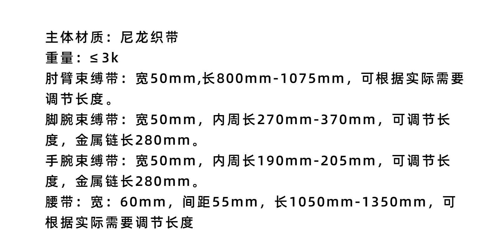 黑色面料为尼龙编制带,柔软性强,便于携带,使用方便,不易断裂。外观:约束带表面应平整、光滑,无划痕、尖锐菱角等缺陷。各部位连接圆滑。结构:约束带的组成由手臂束缚带、手腕弯束缚带、脚腕束缚带三部分组成,锁扣采用专用强磁锁扣。主体材料:尼龙带/不锈钢耐盐雾等级:≥6级,8h耐磨擦色牢度:﹥4级耐用度:﹥6000循环次牢固度:金属连接件、各锁定点可承受静拉力40000N。